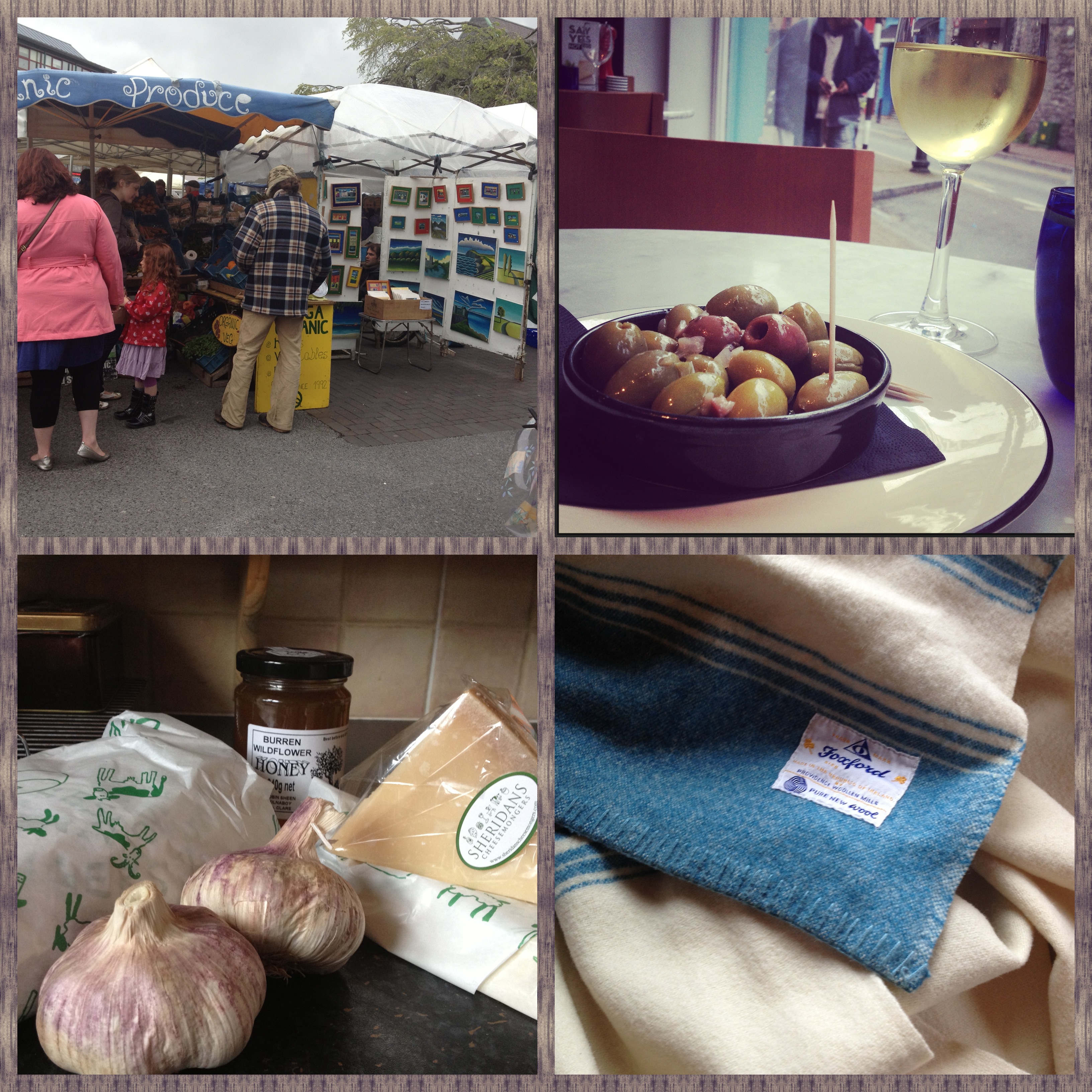 So I embraced it all. I stopped to listen to the music. I laughed at the entertainer, dressed like a dog lying on a box, that growled and woofed and howled as people passed. I spent time in the market, smelling all the organic herbs and touching vegetables whilst wondering if my garden would ever produce such goodness. I bought comfrey plants. I bought smelly cheese at Sheridans, the most amazing cheesemongers EVER. I drank some tea.I stocked up on all my health food.And not forgetting a few little presents for my babies. Browsing a charity shop I hit the jackpot – a double Foxford blanket with blue edging – for €10!!!! (I LOVE Foxford blankets. They remind me of bygone days! Simple days. Big heavy wool blankets for warmth.) Lunch at Milano’s pizza restaurant was much anticipated and I savoured every bite. A little glass of wine made it feel special, and a beautiful mint tea finished it off nicely. Funnily I never feel odd having a meal by myself in Milano’s. I feel almost cool! But thats what happens to you when you visit Galway, its makes you feel like you belong, like you’ve all the time in the world even when you don’t, and even though I hail from Dublin, I think there may be a bit of a Galway girl within me.